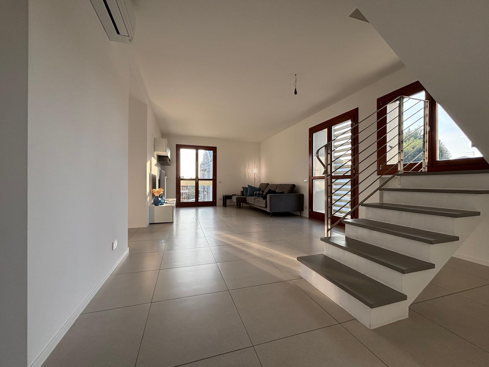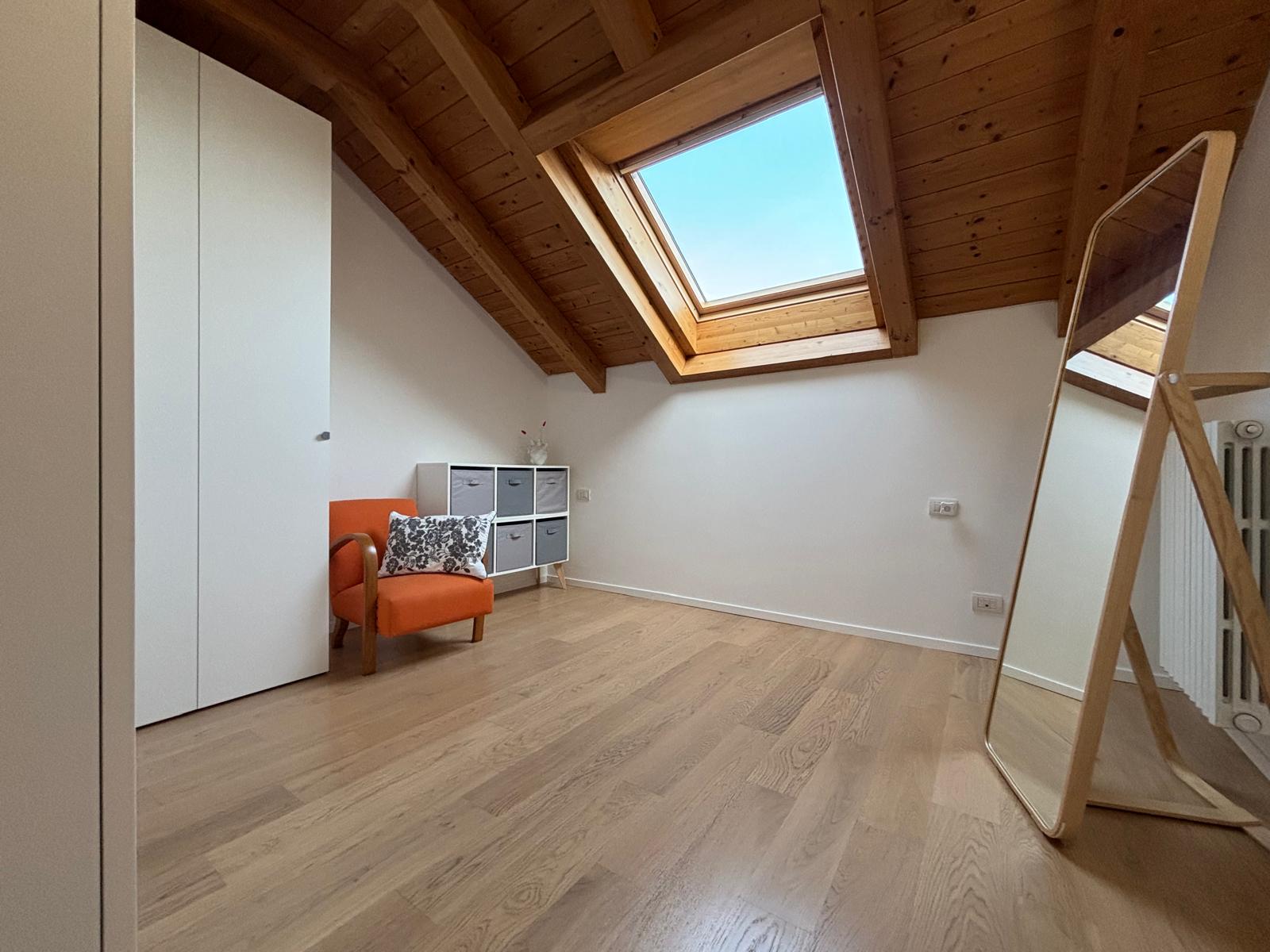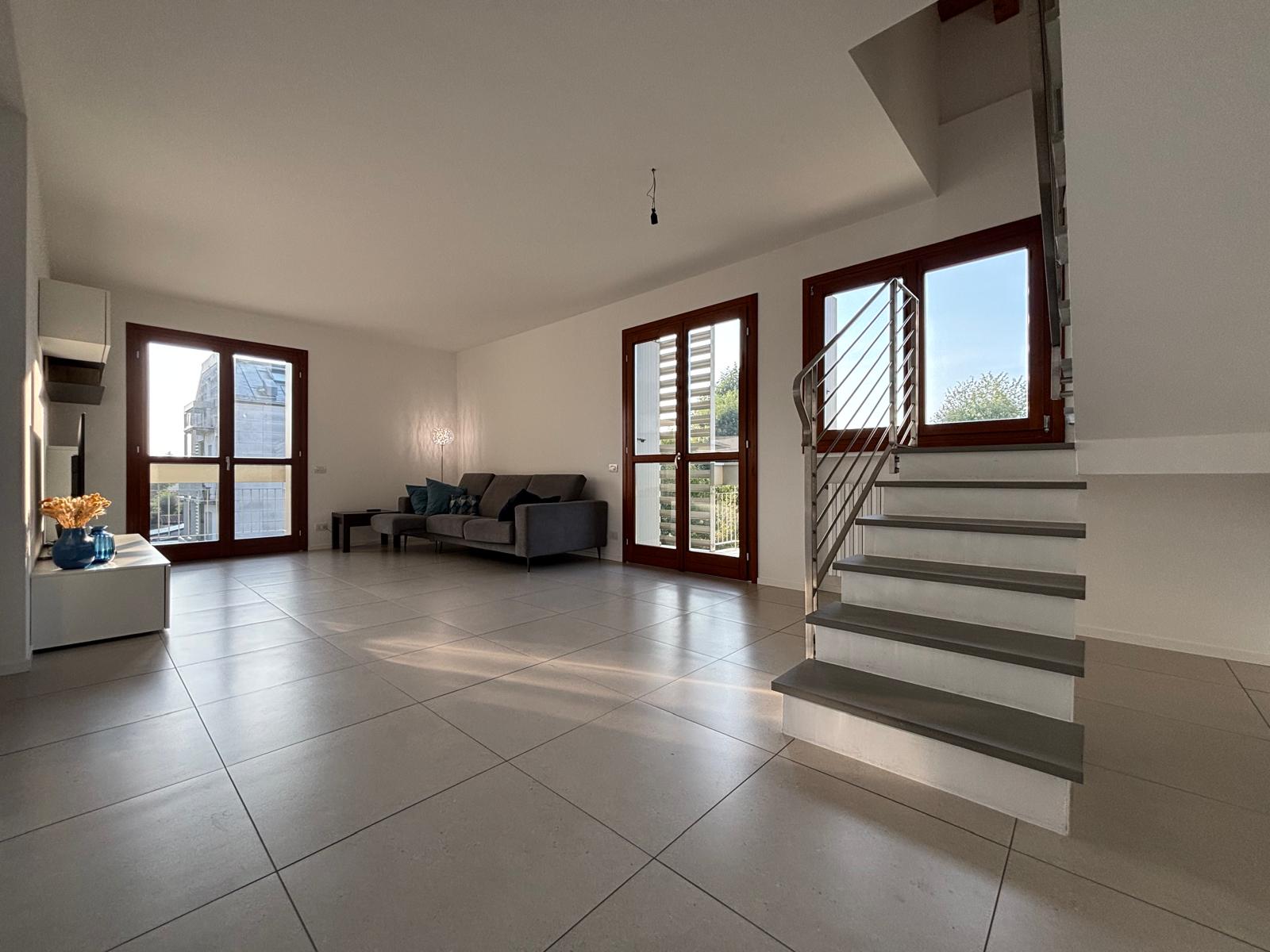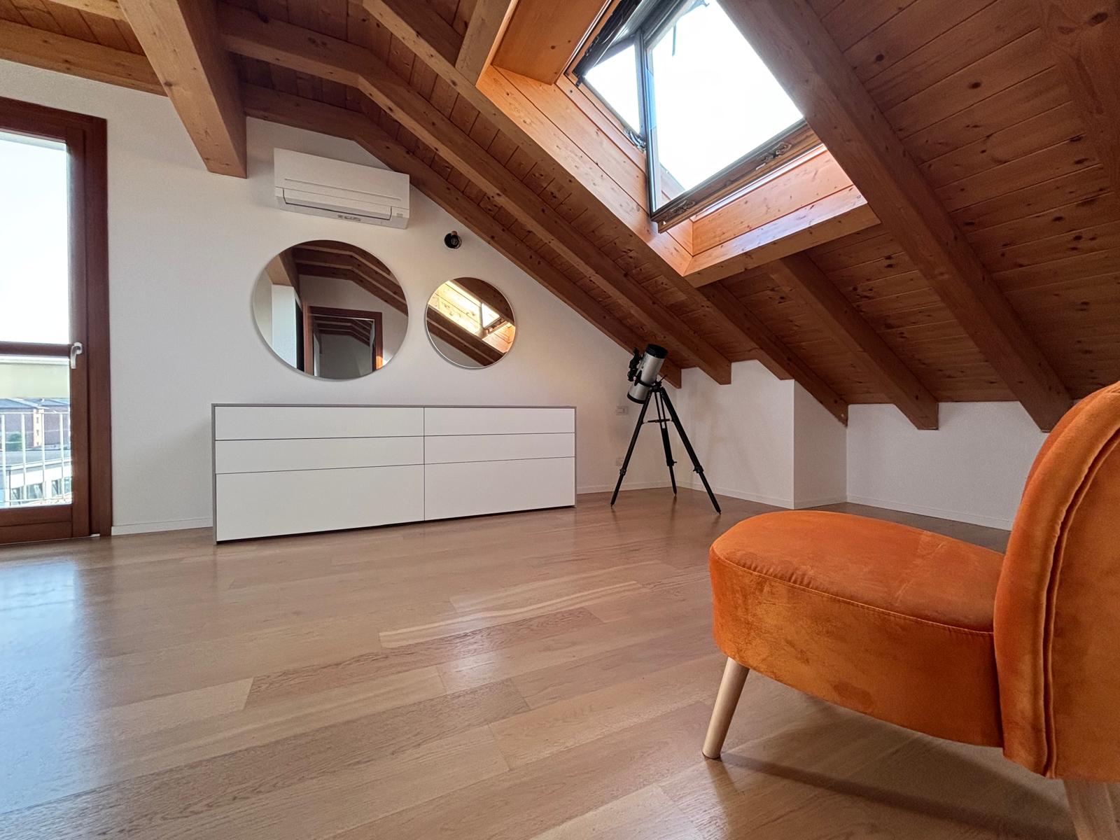Di recente ultimazione e “COME NUOVO”, inserito in un complesso di due piccole palazzine di 8 appartamenti ciascuna, libero subito, ampio ed elegante appartamento disposto su due livelli (secondo e terzo piano collegati da una comoda scala rivestita in pietra con particolari in acciaio) di circa 180 mq. complessivi con un triplo affaccio così composto: P.2°: grande salone / pranzo, cucina abitabile, lavanderia, camera matrimoniale o studio e bagno padronale; P.3°: ampio sottotetto mansardato con altri due grandi locali (il primo di 36 mq. e il secondo di 13) e una lavanderia / bagno. Balconi su tutti i locali. Grande luminosità ed ottima esposizione. Il piano sottotetto è rifinito con travi in legno a vista e presenta altezze variabili (con una media di quasi 2,40 mt.), ampi velux e comode porte-finestre. Pavimenti: gres di grande formato nella zona giorno e parquet a listoni in mansarda. Impianti: riscaldamento centralizzato con nuova caldaia a condensazione, climatizzazione autonoma completa di macchine esterne e split; antifurto volumetrico e perimetrale. Cantina e ampio box annessi. Possibilità di un secondo box (ad €. 18.000). Classe energetica: D – IPE: 107,70 KWh/mq.a. Il contesto è tranquillissimo, immerso nel verde, comodo con la superstrada Milano/Meda, a circa 1 km dalla Stazione Ferroviaria (FNM e FF.SS.) di Lentate S/S e in prossimità di scuole e del centro cittadino di Meda.