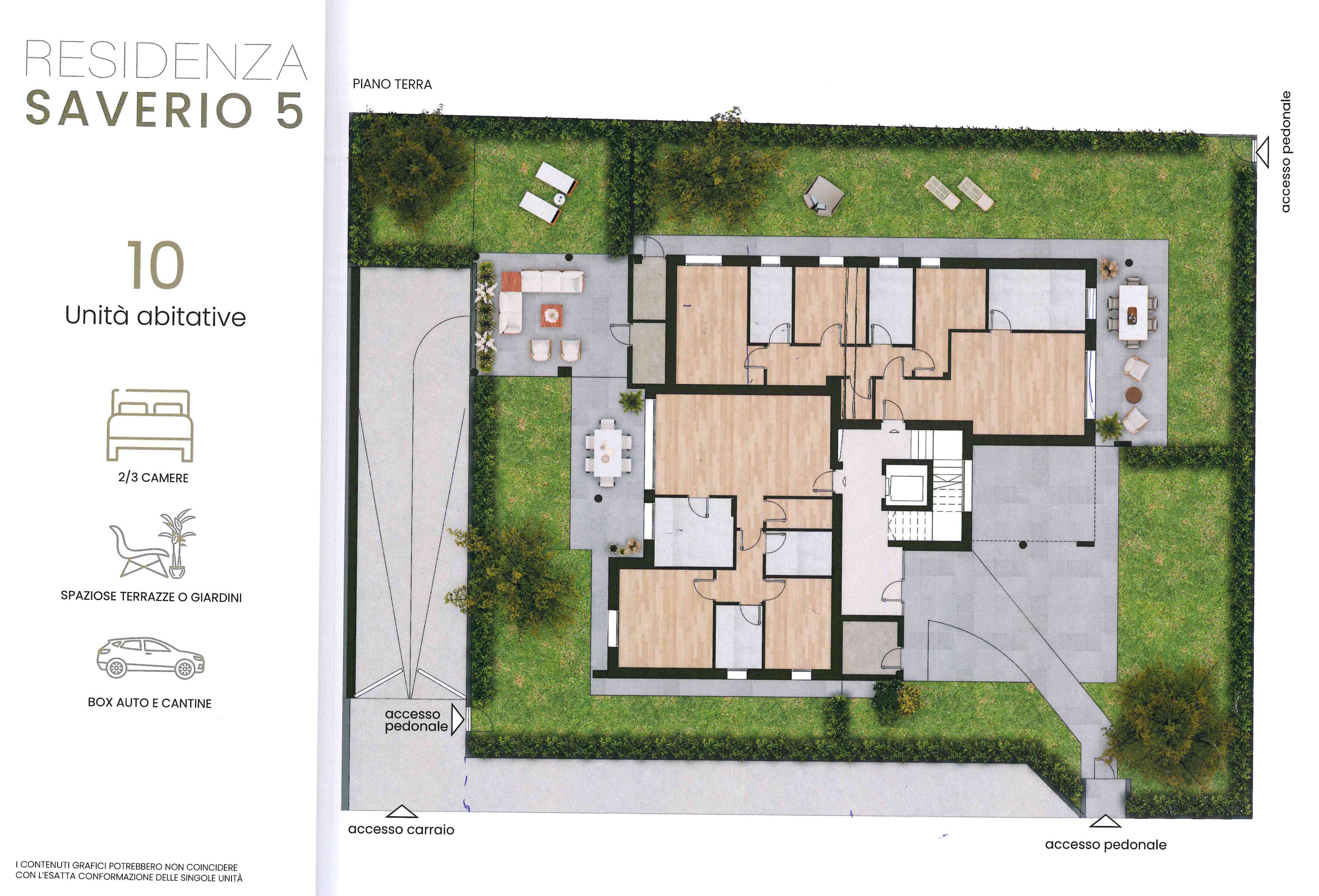 Sono previsti un ingresso pedonale ed un ingresso carraio direttamente dalla via Saverio. La residenza prevede autorimesse al piano Interrato.