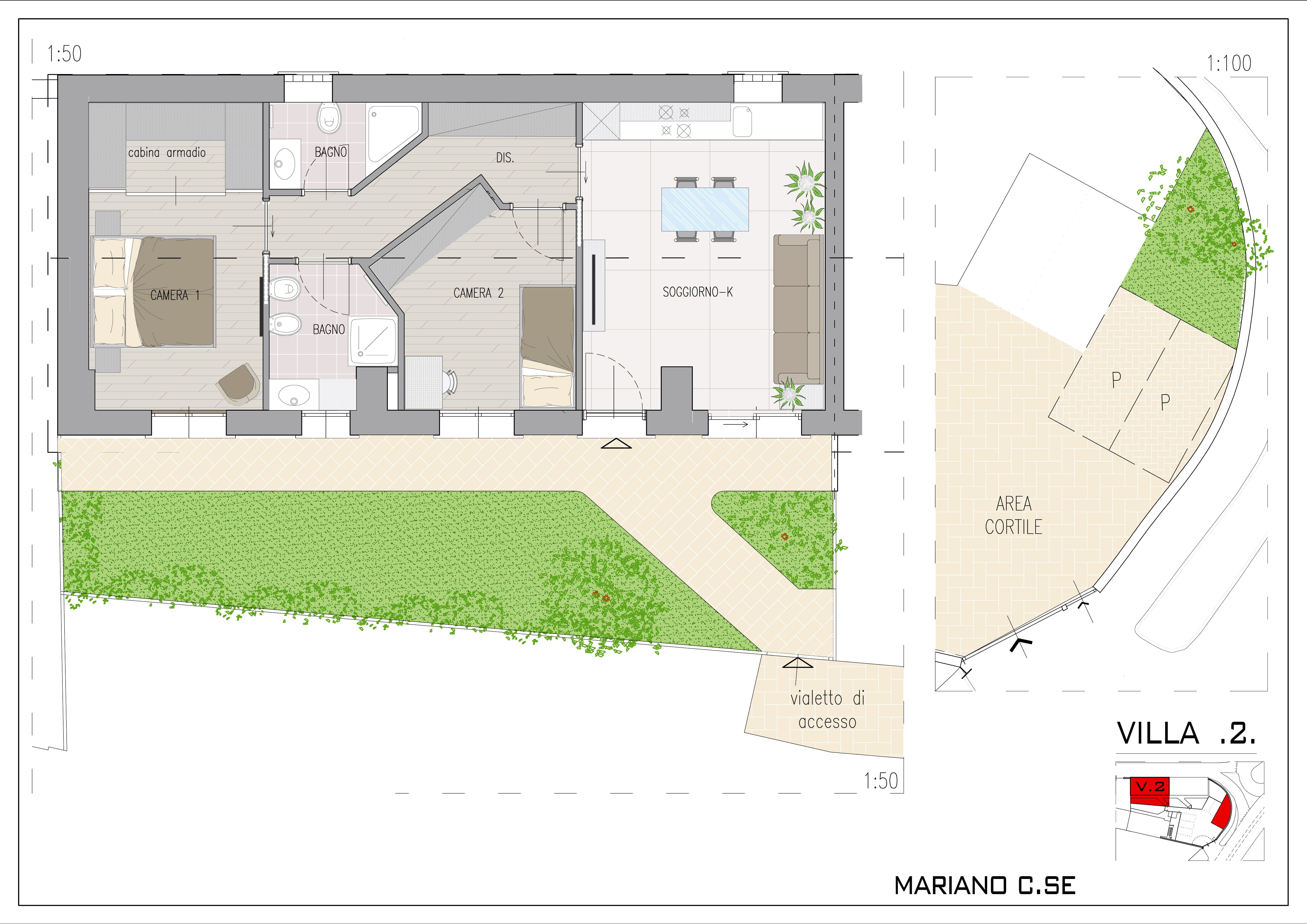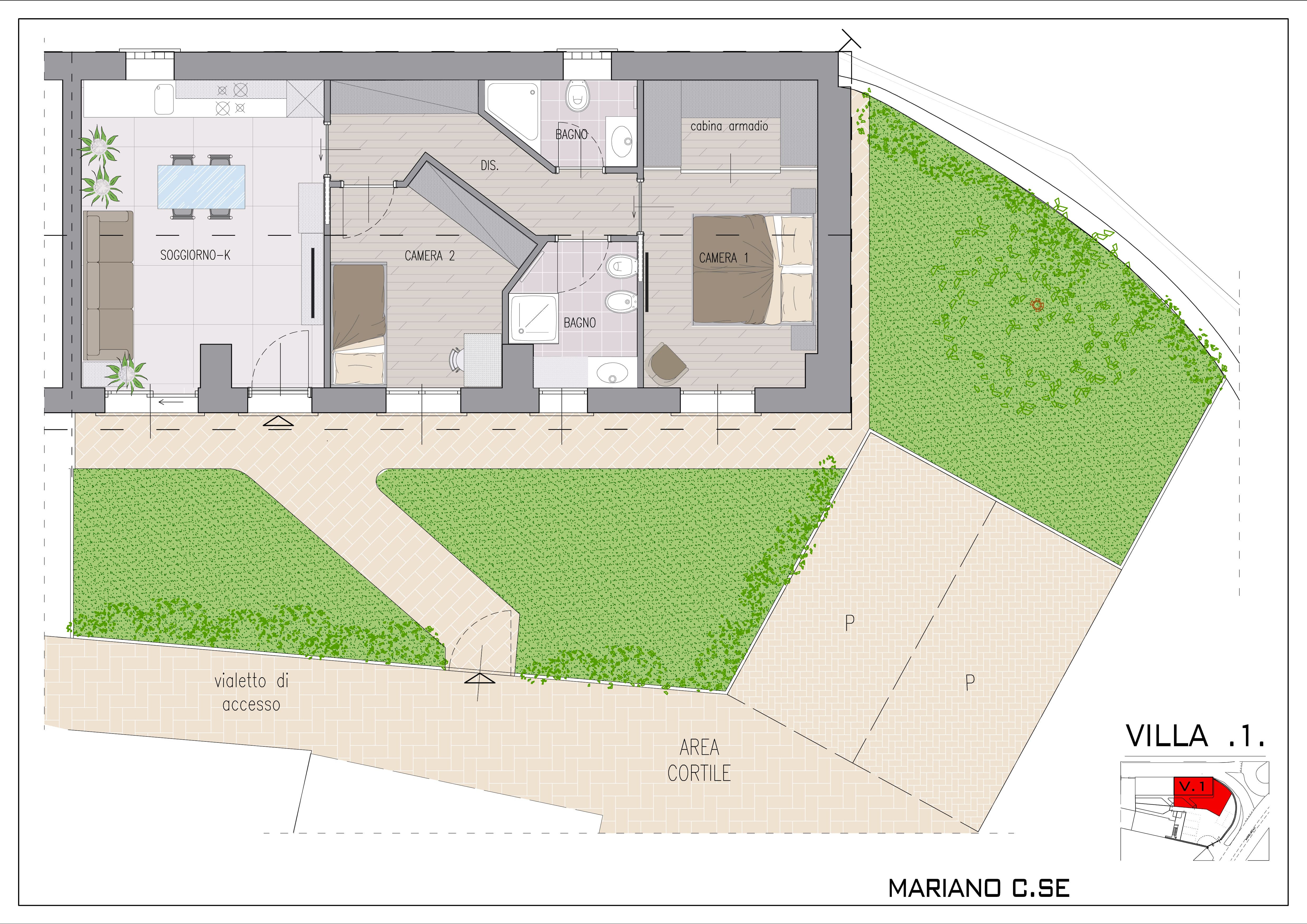 VILLETTA composta da soggiorno con cucina, camera matrimoniale con cabina armadi, cameretta, 2 bagni finestrati, giardino privato e 2 posti auto. €. 255/265.000.