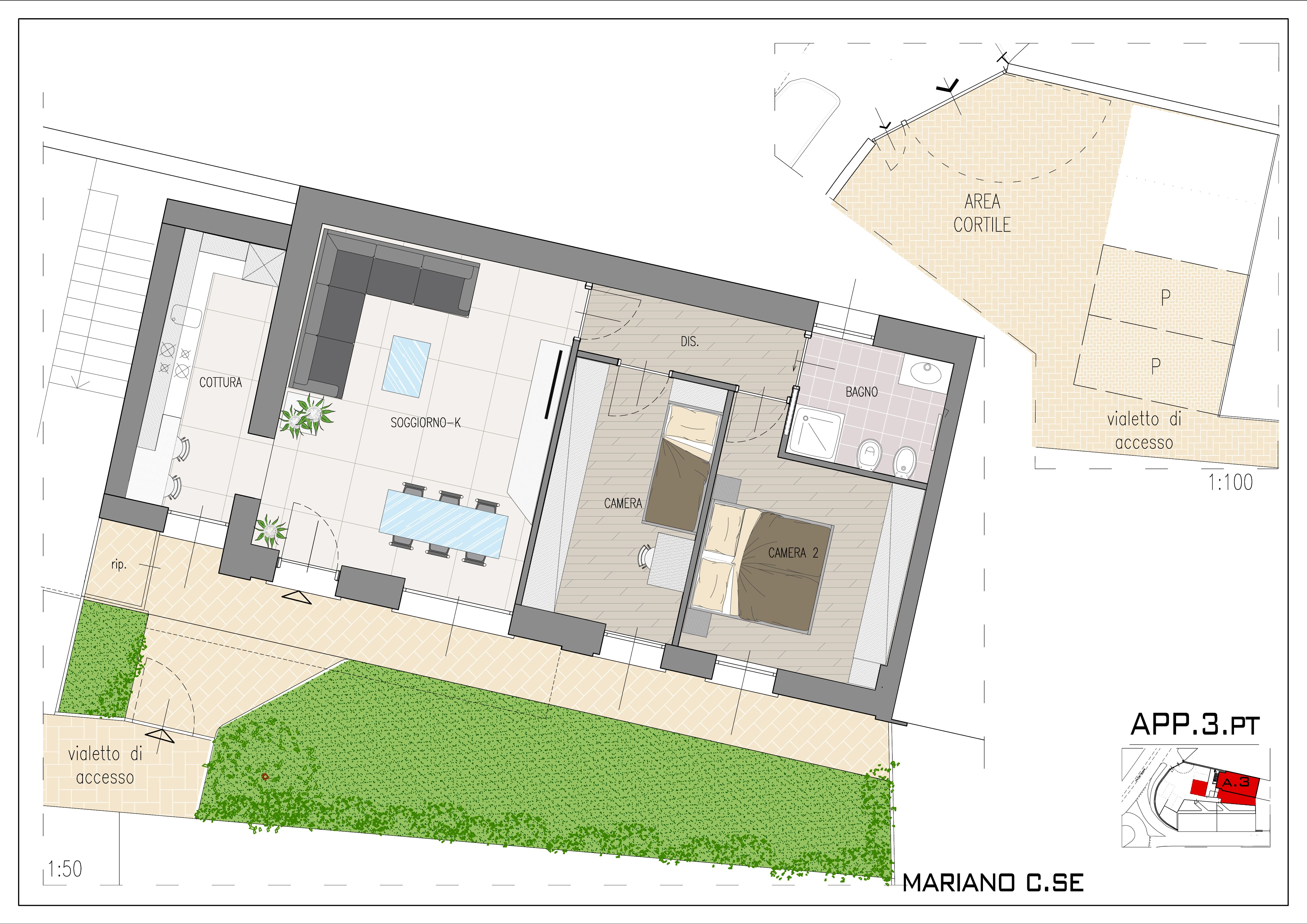 APPARTAMENTO AL PIANO TERRA composto da soggiorno, cottura separata, camera matrimoniale, cameretta e bagno. Giardinetto privato e 2 posti auto. €. 245.000.