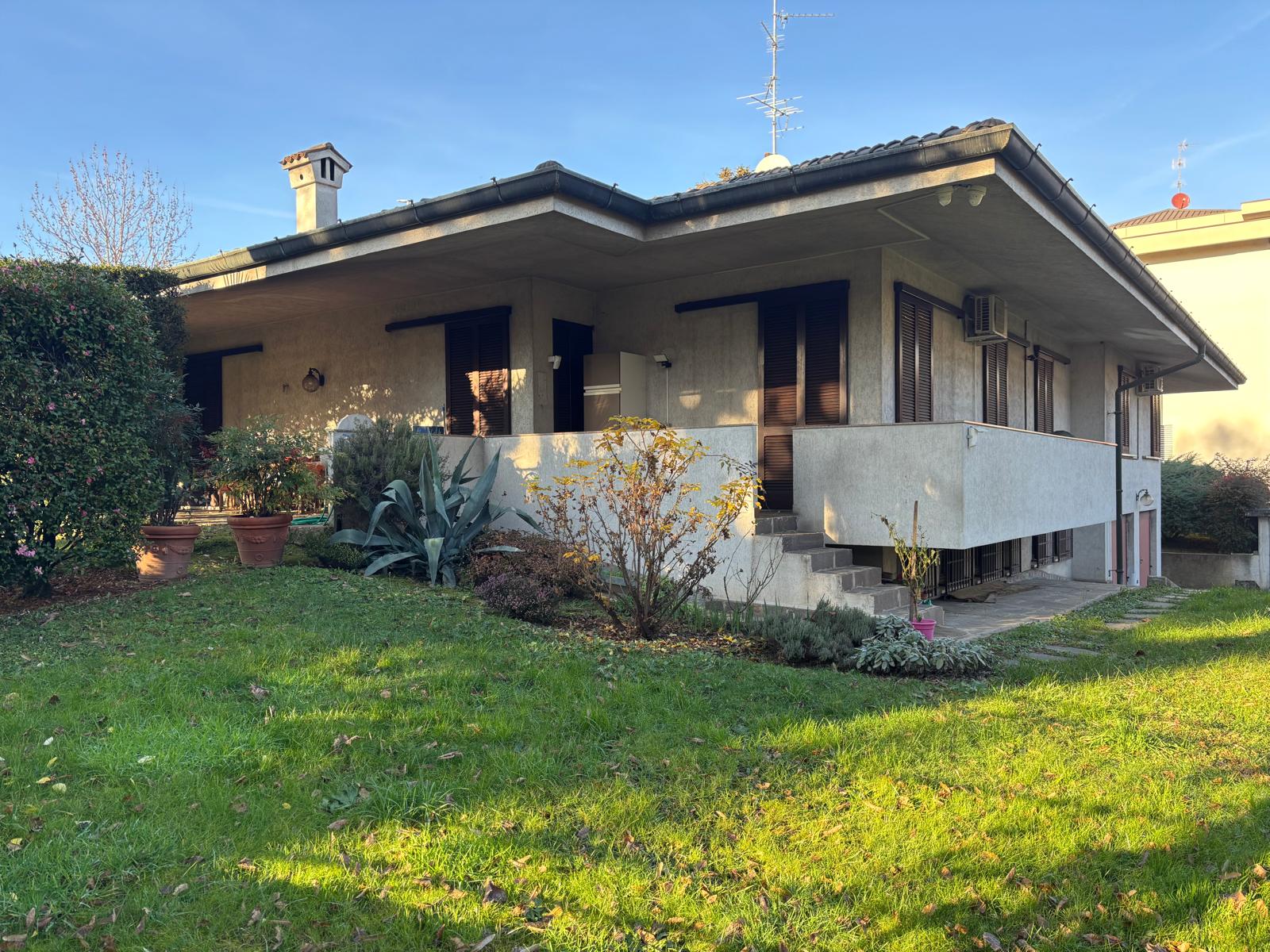 Zona Piscine, in un contesto tranquillo, residenziale, in prossimità del centro, defilata dal traffico, signorile e riservata VILLA UNIFAMILIARE dei primi anni ’80 disposta su un unico livello, dalla comoda metratura e dagli spazi ottimamente distribuiti. Ingresso, salone, pranzo con cucina ed un grande loggiato coperto esposto a sud, 3 comode camere, due bagni ed un grande interrato di pari metratura con ampia autorimessa, locali cantine e accessori. Costruita al centro di un bel giardino piantumato di oltre 1000 mq. che la raccoglie in un’oasi di verde, la villa, di 200 mq. per piano, già libera ed in pronta consegna, presenta pochi interventi per renderla da subito abitabile. In attesa di certificazione energetica.
